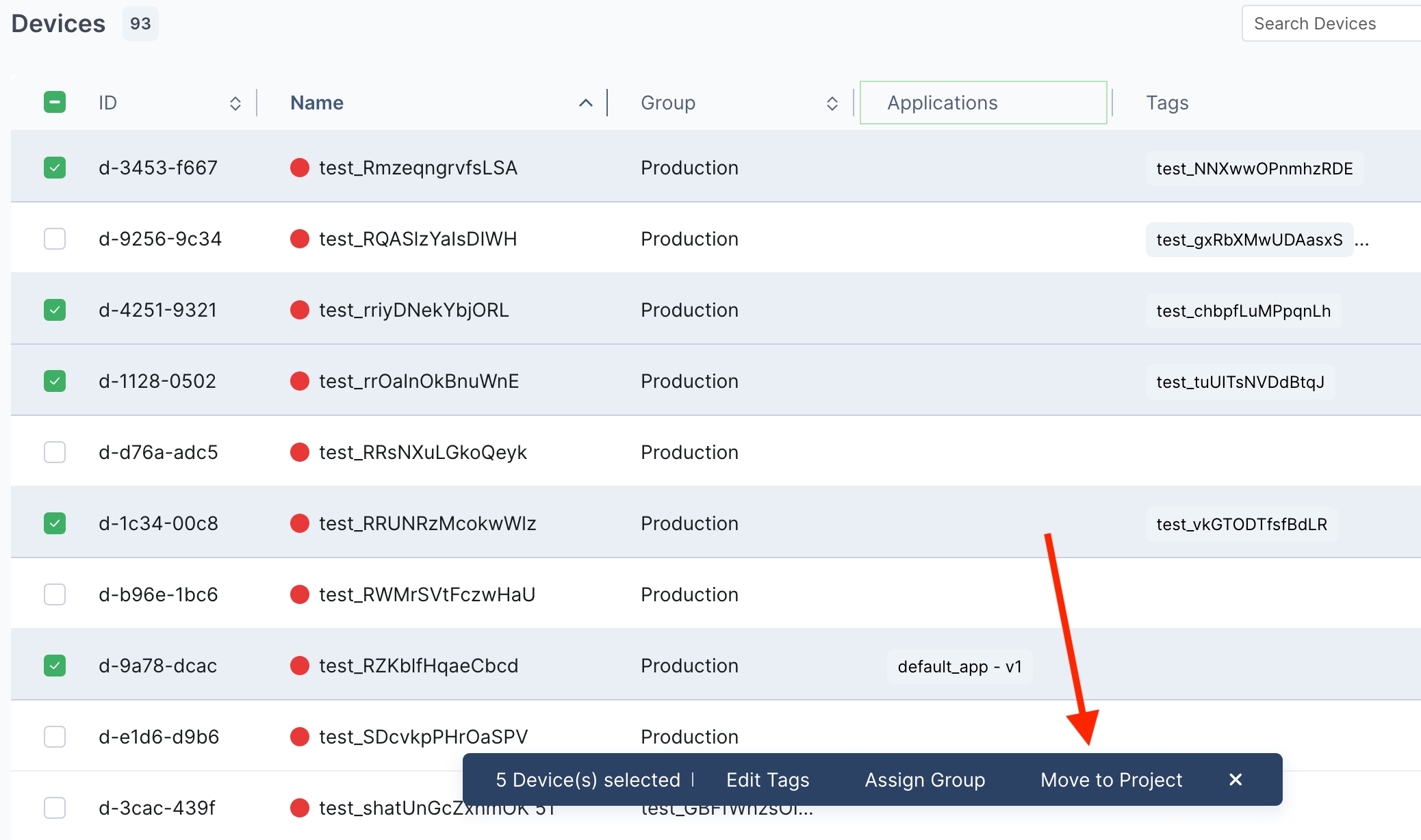 After you have applied the move, you can switch to the other project and see that the devices appear in the Devices table. If you do not see them, you can search for them in the Search bar or apply a different filter to the Devices table.