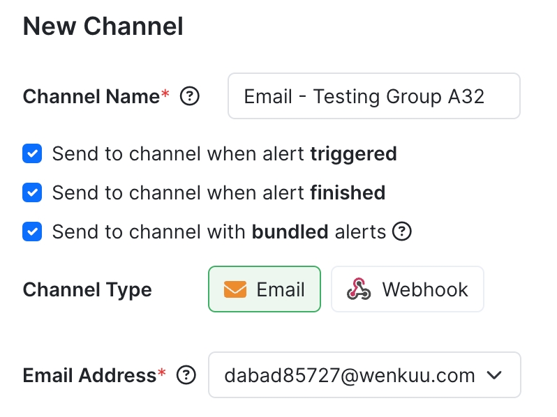 Channel Type: Can be Email or Webhook. If you choose Email, enter the email address as shown below. The address must exist already. The email body is a standard email and cannot be customized.