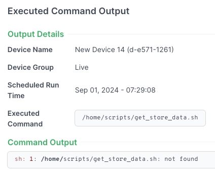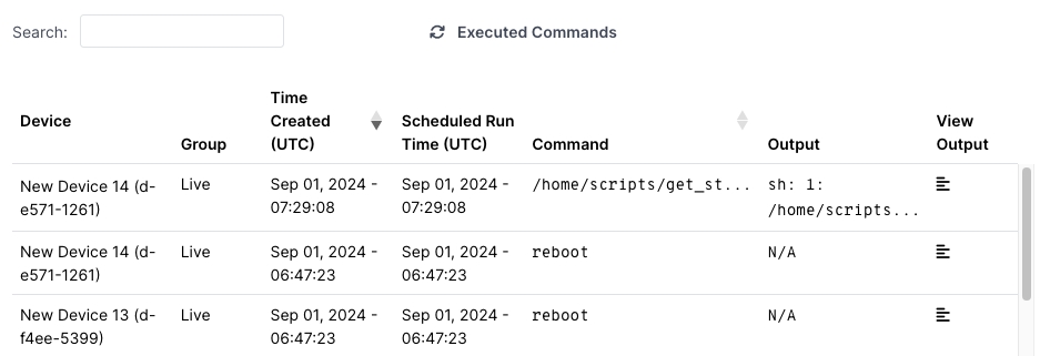 After you have run a command, you can scroll down the Command Runner page to see the Executed Commands. For each command, the table shows a separate row for each device that received the command.