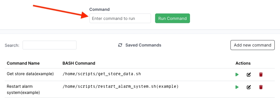 Go to Remote Tools/Command Runner in the left menu and enter a Bash command in the Command field. Click Run Command.