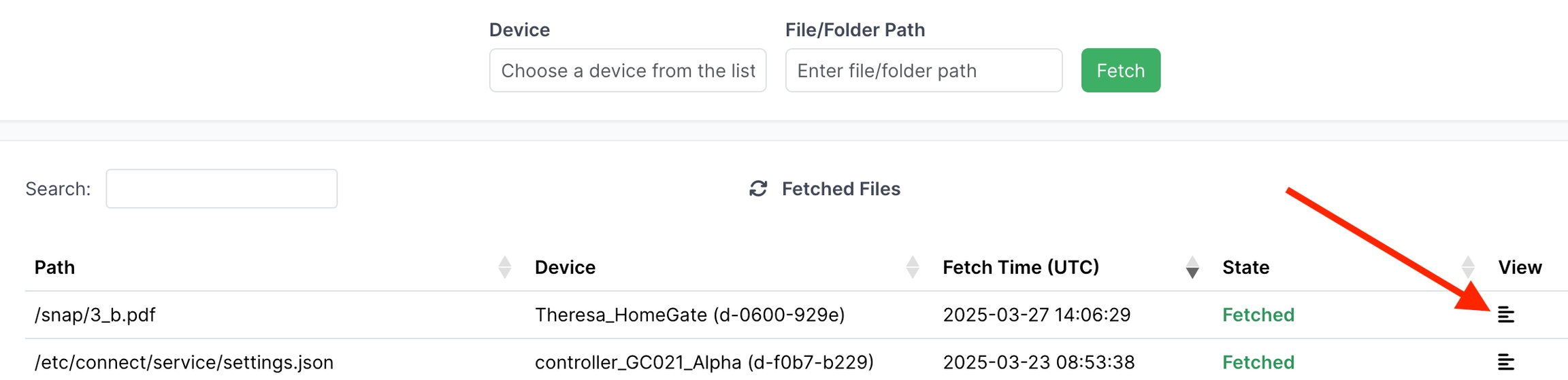 When your file or folder has been fetched successfully, click the icon in the View column.