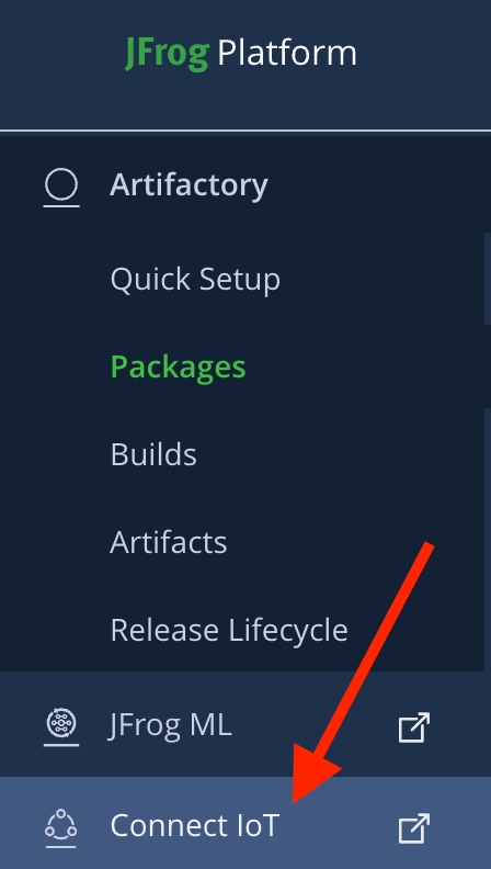 When the JFrog Platform page appears, go to the left navigation bar and choose Connect IoT.