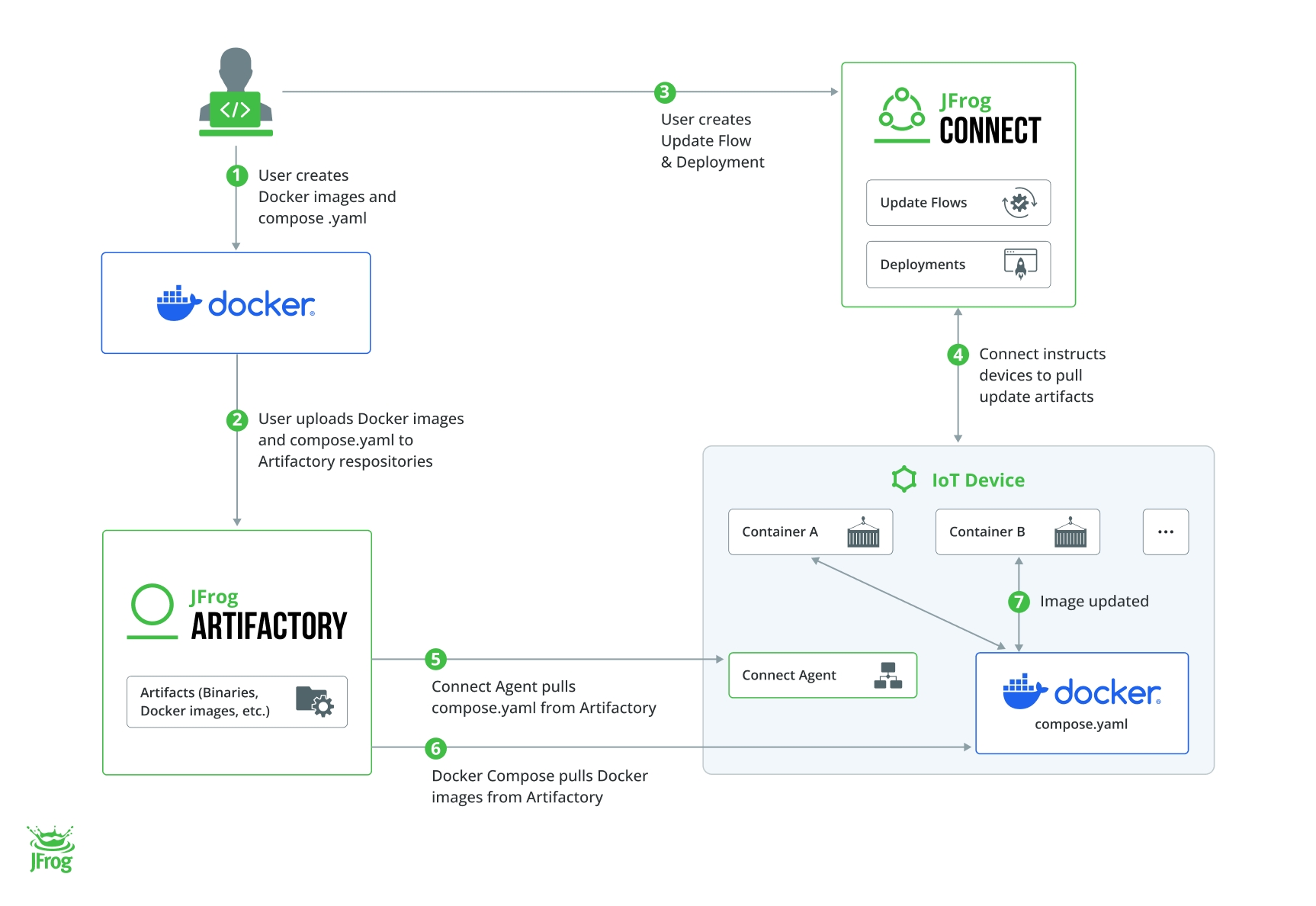 The Docker Compose in the device updates the Docker images on the device with the new ones it received from Artifactory.