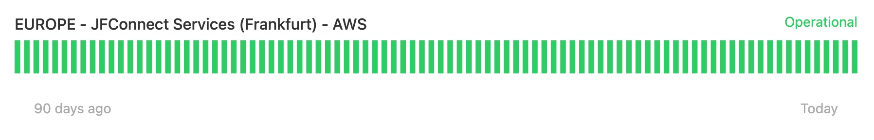 JFrog provides a page, JFrog Cloud Status, where you can check the status of the JFrog Connect server. In addition, you can check the status of other JFrog servers in regions around the world.
