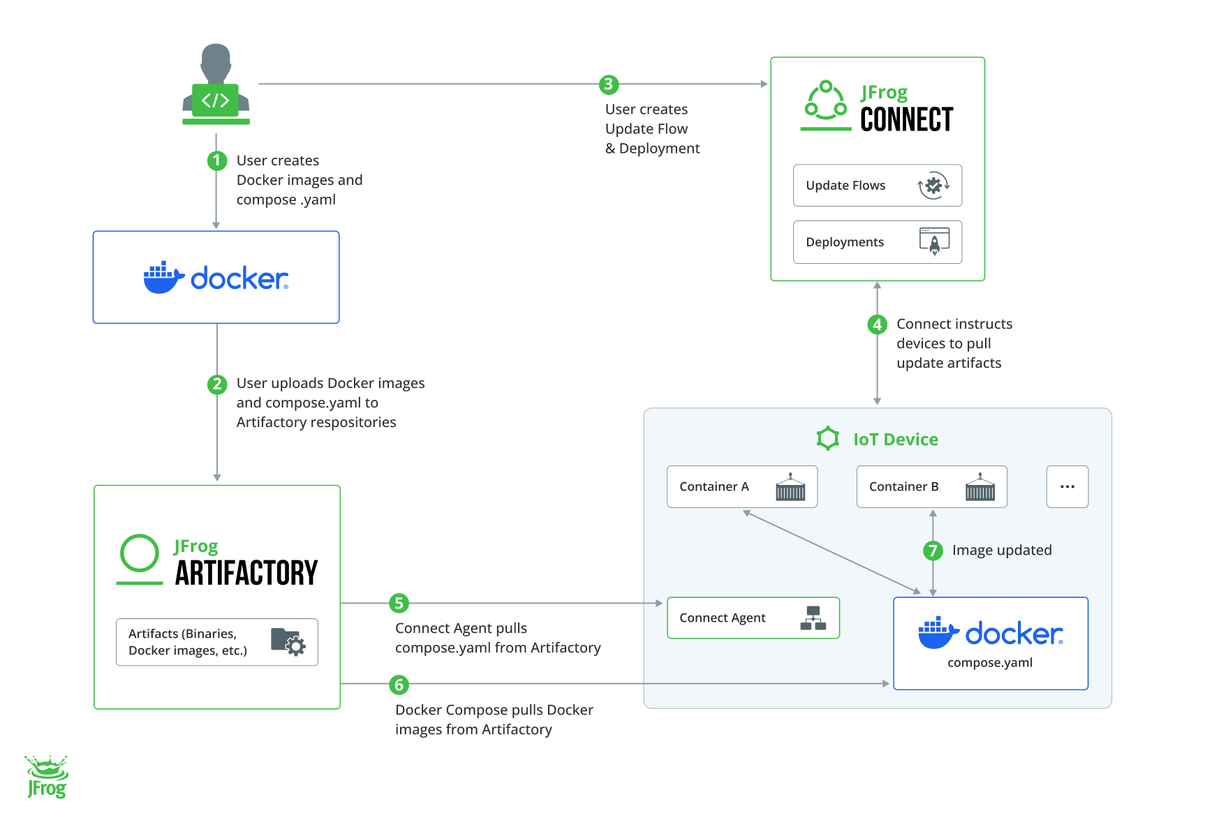 Connect has created a process for updating software in your devices that is simple and repeatable. The illustration below provides an overview of the process and the actors involved. The stages in the process are numbered to show the order of events, and each stage is described in detail. The example below is for the [Deploy Docker Compose](https://docs.connect.jfrog.io/features-new-ui/deployments/update-flow/step-types/use-docker-compose) use case. Other deployment use cases will differ in some details.