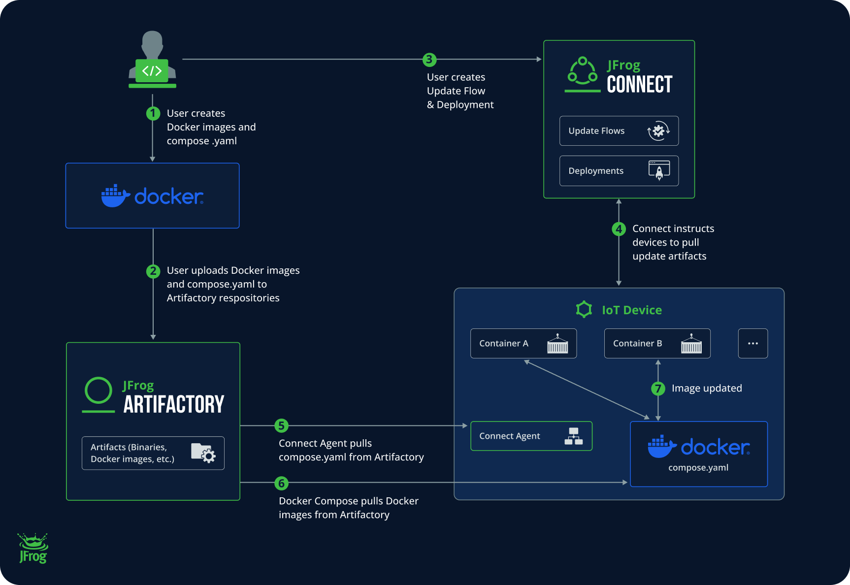 The Docker Compose in the device updates the Docker images on the device with the new ones it received from Artifactory.